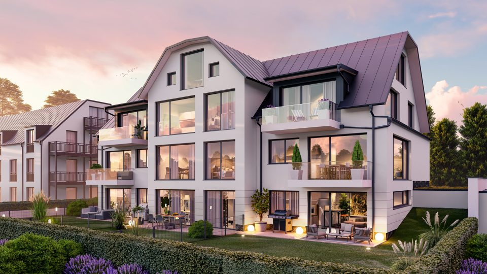 Das Neubau-Mehrfamilienhaus in der Nähe von München bietet den neuen Eigentümern neben geräumigen Gärten und Terrassen, moderne und klare Wohnräume. Die großen Fenster lassen viel Licht in die gemütlichen Wohn- und Schlafzimmer. Wir visualisierten dieses schicke Objekt auf Basis von Ansichten, Grundrissen und Schnitten.